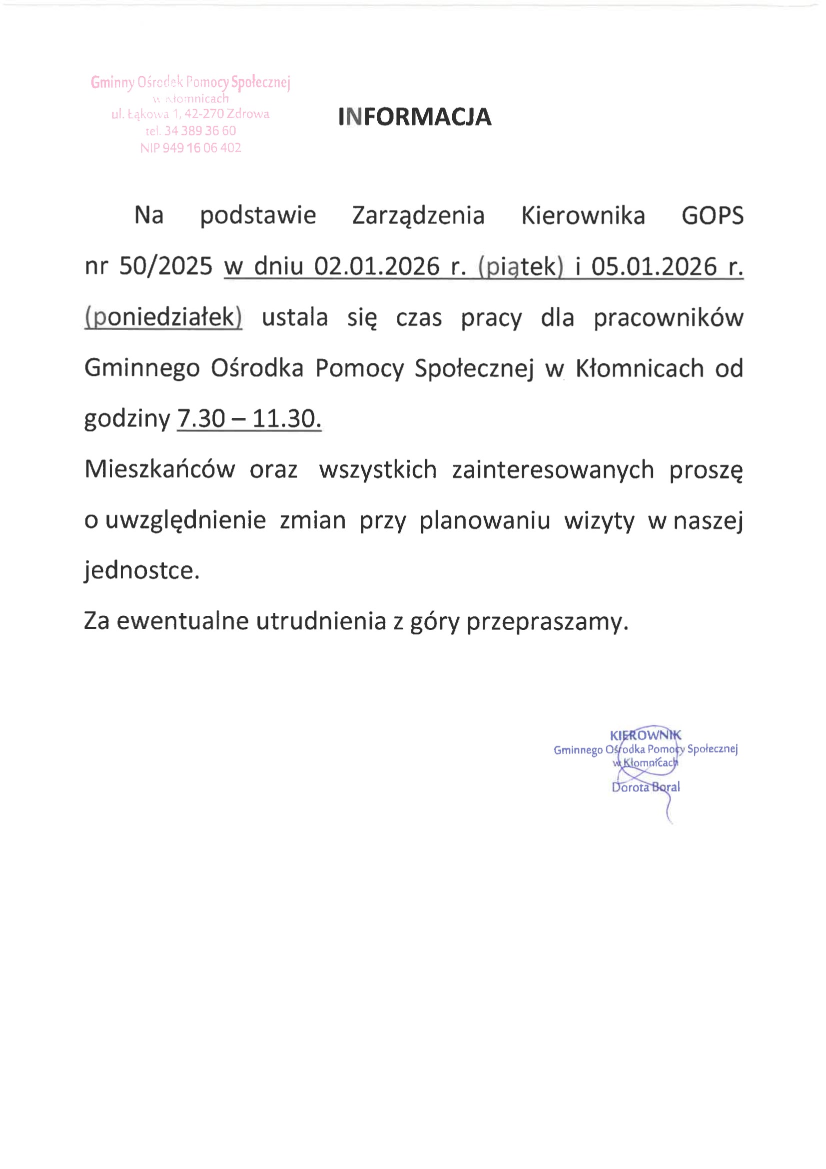 Skrócony czas pracy Ośrodka