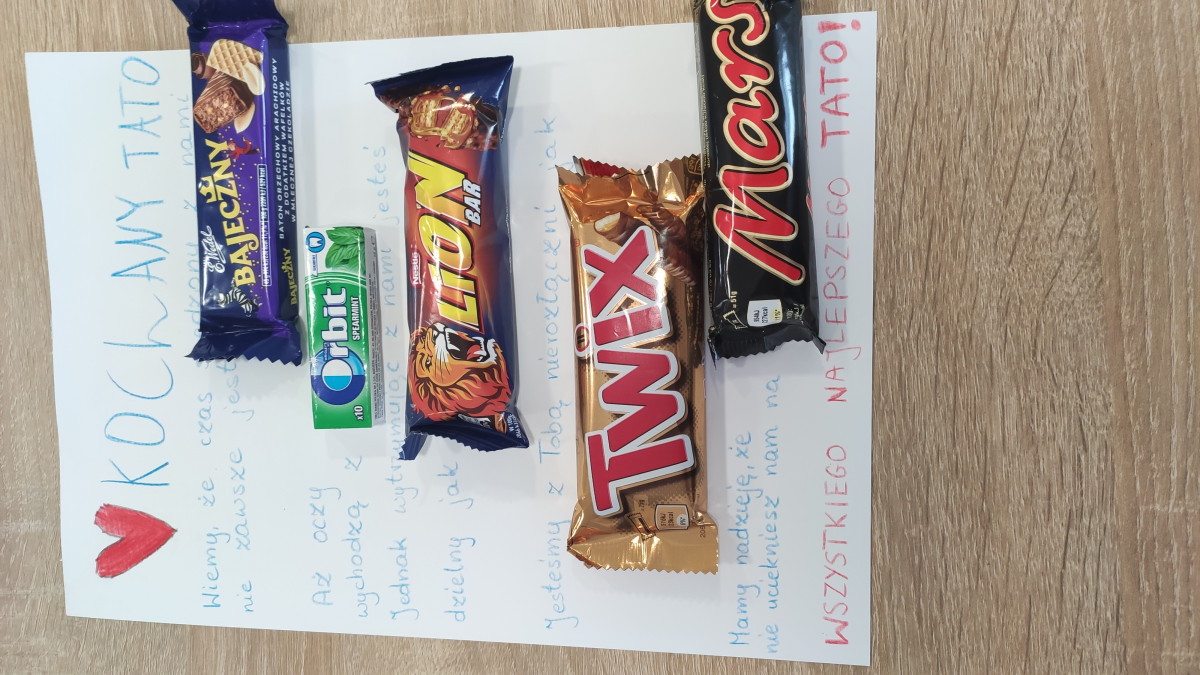 Dzisiaj wielkie święto Dzień Ojca. Mieliśmy dużo pracy z przygotowaniem upominków dla swoich tatusiów, a jeden z uczestników dla swojej mamy. Praca polegała na wykonaniu laurek, wypisaniu pięknych życzeń raczej o treści uznaniowej uzupełniając niektóre słowa słodkimi batonikami.